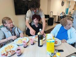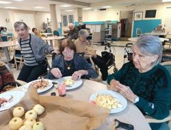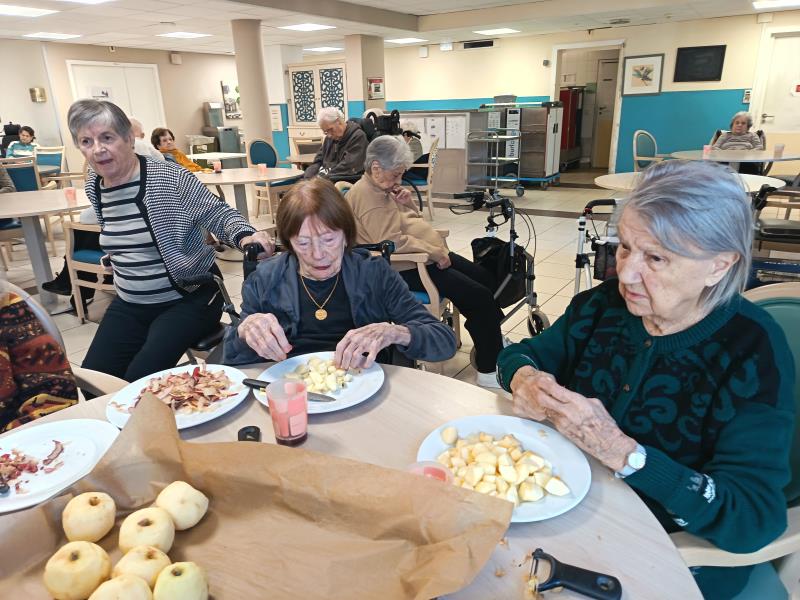 Autour de la grande table, chacun avait son rôle. Claudine, Élise, Sophie et Maguy épluchait les pommes, Régina et Huguette les coupaient en petits bouts. Quant à Mimi et Carmen, elles mélangeaient la pâte telles des cheffes étoilées.