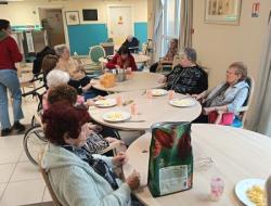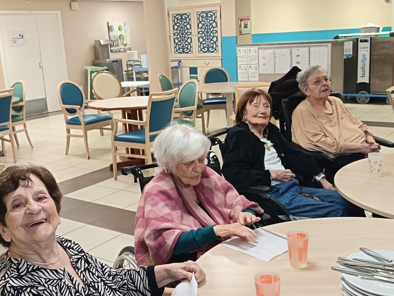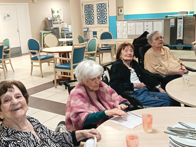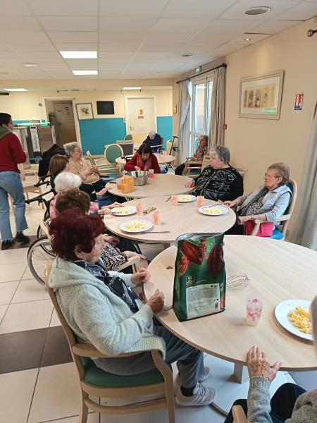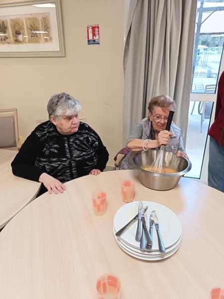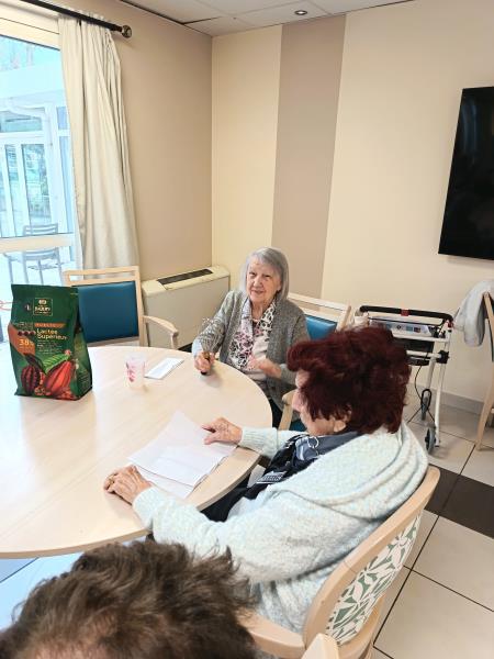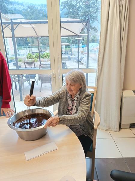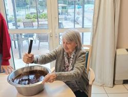 En EHPAD, la réalisation d'un gâteau au chocolat est une activité très sérieuse... surtout quand il s'agit de goûter ! Chacun participe à sa façon : certains découpent le beurre, d'autres mélangent et les plus expérimentés surveillent que personne n'oublie le chocolat.