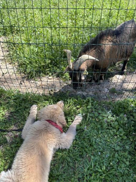 Charlot, notre petit bouc, et Cooper, le chiot de l’animatrice, ont fait connaissance pour la première fois… un moment attendrissant qui a fait sourire tout le monde !