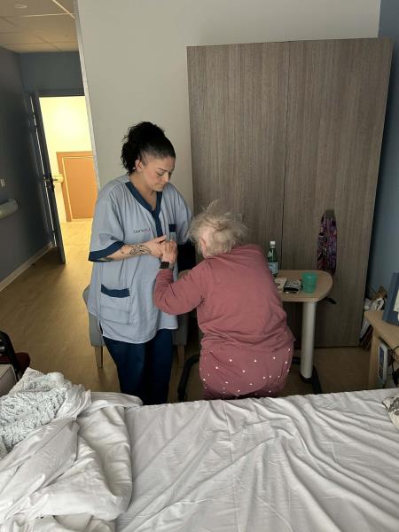 Pendant ce temps, les aides-soignants accompagnent les résidents dans leur réveil, avec douceur et attention. Installation confortable dans le lit ou au bureau, ouverture des volets, premiers mots de la journée… ces gestes simples font toute la différence et illustrent pleinement les valeurs de bienveillance et de respect portées par le groupe DomusVi.